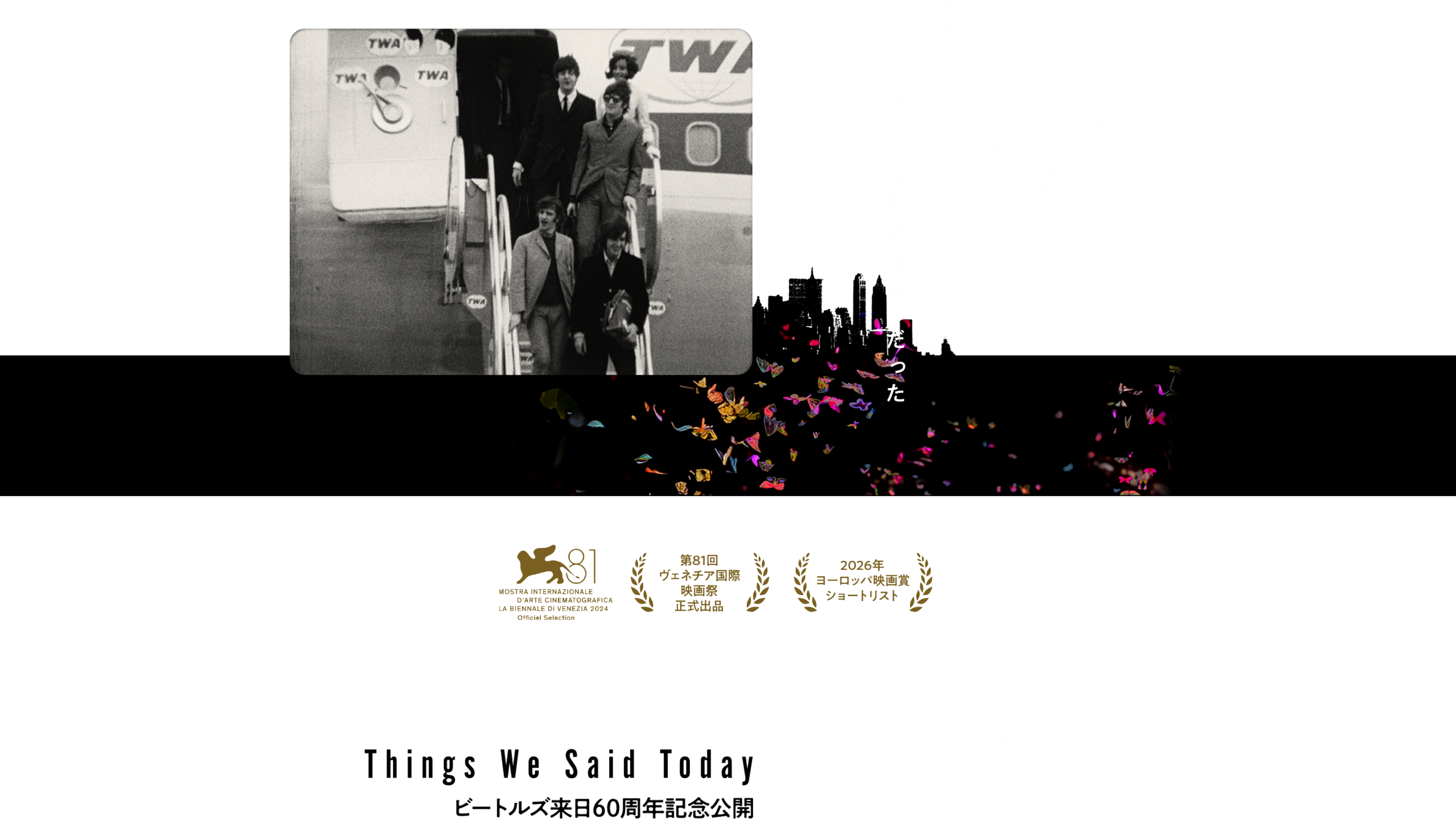 ポール・マッカトニーが「未来のノスタルジア」と呼ぶビートルズの小さな名曲『Things We said Today(今日の誓い)』をタイトルにすえた本作は、100時間以上のニュース番組と100時間の個人の8ミリフィルムから抜粋したアーカイブ素材で構成される。フランスのアーティスト、ヤン・ケビによるアニメーションを重ね合わせ、ドキュメンタリーの巨匠アンドレイ・ウジカ監督は、失われていく世界にあって儚くも鮮烈な「帰り来ぬ青春」を詩情豊かに描いた。